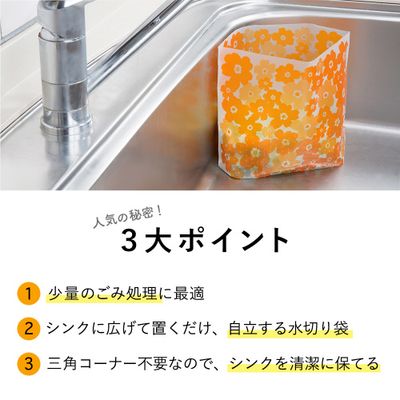 少量のゴミ処理に最適です。シンクに広げて置くだけ、自立する水切りゴミ袋です。三角コーナー不要なので、シンクを清潔に保てます。