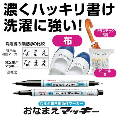 マッキーの「おなまえペン」。布に書いてもにじみにくく、強力な洗剤で繰り返し洗濯しても消えにくい!細字・極細字の両用タイプです。