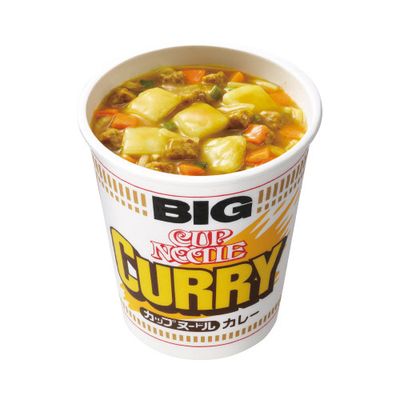 カップヌードルカレーのビッグサイズ。カレーが絡むコシのある太めんに、野菜の甘味のあるマイルドでとろみのあるカレースープ。具材はポテト、ダイスポーク、にんじん、オニオン、ねぎが入っています。