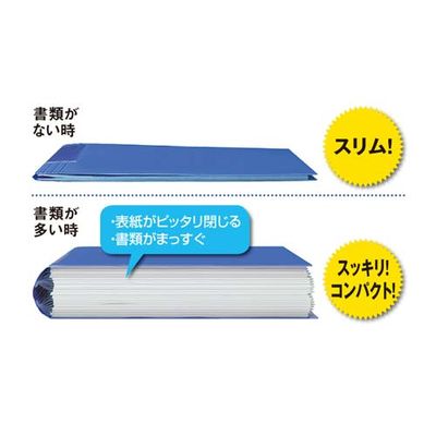 背幅が変わるコクヨのクリヤーブック!書類をラクに出し入れできるウェーブカットポケットです。不透明表紙、中紙ありタイプになります。背とポケットが溶着されている固定式です。