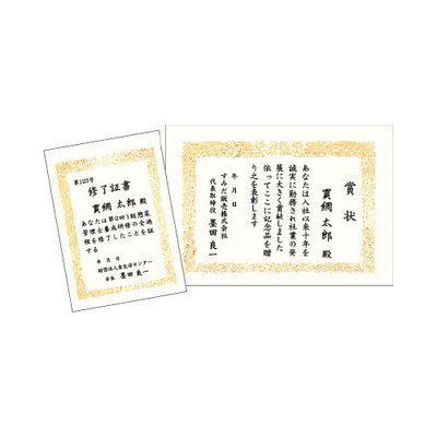 金箔仕様で紙厚がある豪華なプリンタ対応賞状用紙です。(コピー,レーザー,インクジェット)手書き用としてもお使い頂けます。賞状のさまざまな内容のテンプレートをホームページより無料ダウンロードできます。