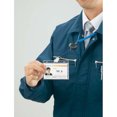 最大約75cm伸びる便利なリール付きストラップ。裏面にクリップがついているので服に固定もできます。