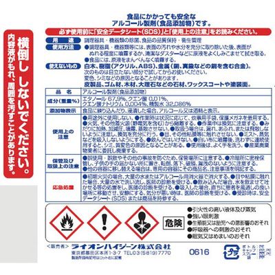 食品添加物で安心・安全なアルコール製剤。水洗い、ふきとりは不要です。