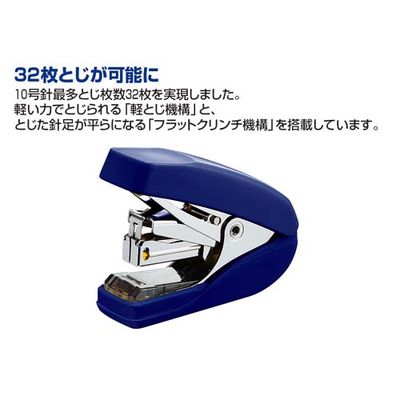 軽とじ機構搭載で、いつも使用している10号針で32枚もの書類を軽くとじることができます。とじた針足が平らになるフラットクリンチ機構。女性の手でもすっぽり収まるコンパクトさで、針を100本装填可能です。