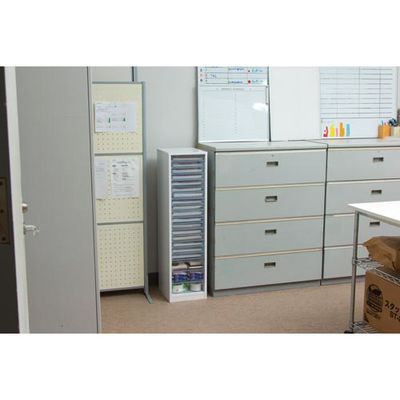 キャビネットの高さに合う高さ1100mmサイズ。小物も書類も収納できる浅型・深型ミックスタイプのフロアケース。