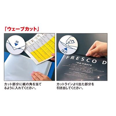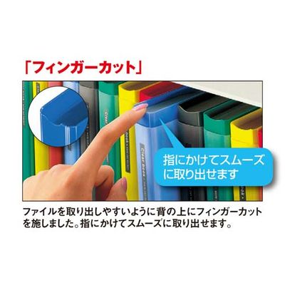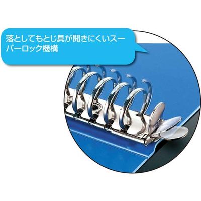 書類の出し入れがしやすいウェーブカットポケット。抜き差ししやすい連結とじ穴。丈夫な発泡PP表紙。落としてもとじ具が開かず書類が抜け落ちないスパーロック機能付き。