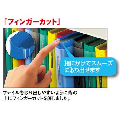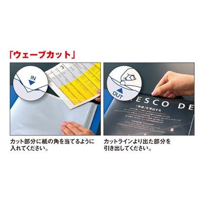 書類の出し入れがしやすいウェーブカットポケット採用の固定式クリヤーブック。棚などからのファイルの出し入れがしやすいフィンガーカット付きで便利。厚口のポケットなので耐久性にも優れています。