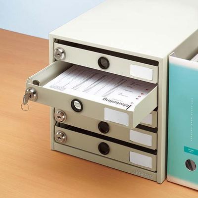 | 一つ一つの引き出しに、それぞれ別の錠が付いたセキュリティレターケース。会社別、グループ別など分類管理に最適です。背面にワイヤーを通せる穴が付いているので、本体の盗難対策もバッチリ。 |