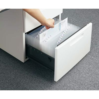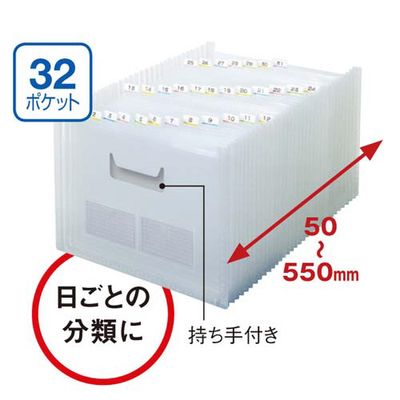 書類の分類収納に便利なアコーディオン式。入れる書類のボリュームに応じて幅を調整出来る、自立・開放型ポケットファイル。卓上やデスクの引き出しに入れて使用可能。分類に便利なインデックスシート付き