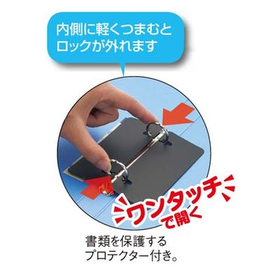 とじ具をワンタッチで開閉できるコクヨのリングファイル。内側をつまむとロックが外れラクに開きます。しっかりした貼り表紙タイプ!
