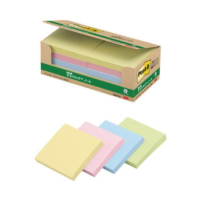 たっぷり入ってお得な通常粘着エコノパック製品。オフィスでの買い置きにおすすめ。詳しい伝言、情報整理などに便利なサイズ。資源の有効利用を考え、古紙パルプ配合率100%の再生紙を使用しています。